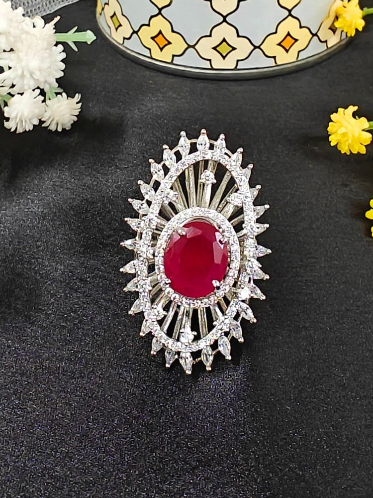 Experience timeless elegance with the Valentina Ruby Red Center Stone Ring. Featuring a stunning large round Ruby Red gem in the center, this ornate ring is encircled by sparkling American Diamonds and set on a versatile adjustable band. Add a touch of glamour to any outfit with this exquisite piece.