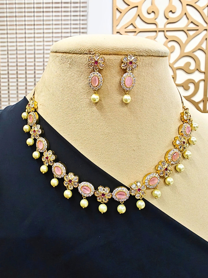 The Mint Pink Samrina Necklace Set boasts stunning mint pink stones accented by sparkling american diamonds and elegant pearl drops. Elevate any outfit with this exquisite necklace and matching earrings. A must-have for any jewelry lover.