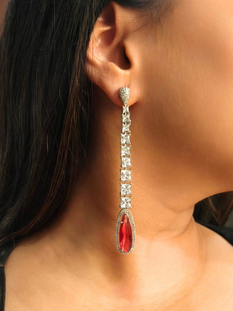 A woman wears the Kendall Red Earrings—long and elegant, set with four square American Diamonds and finished with a bold teardrop red stone—ideal for enhancing a cocktail gown. American Diamond Cocktail Earrings, American Diamond Earring.