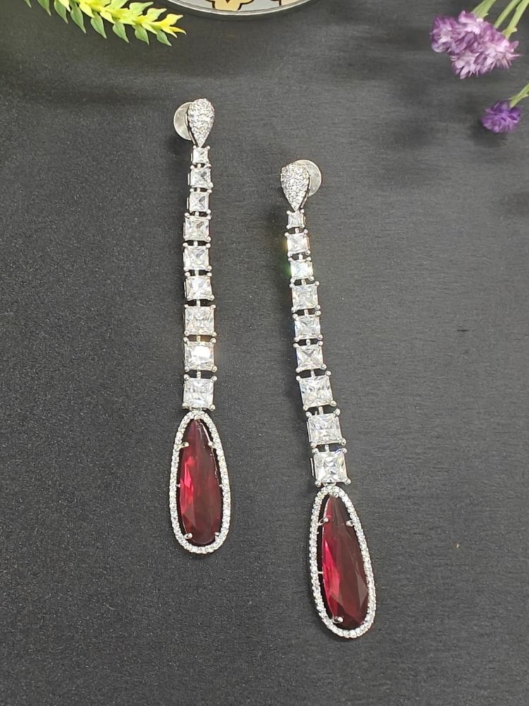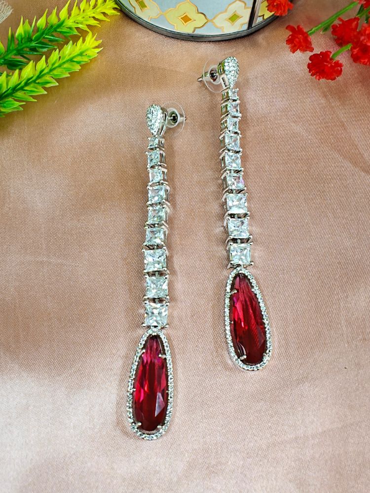 Kendall Red Earrings—long and elegant, set with four square American Diamonds and finished with a bold teardrop red stone—ideal for enhancing a cocktail gown. Set on a black background. American Diamond Cocktail Earrings, American Diamond Earring.