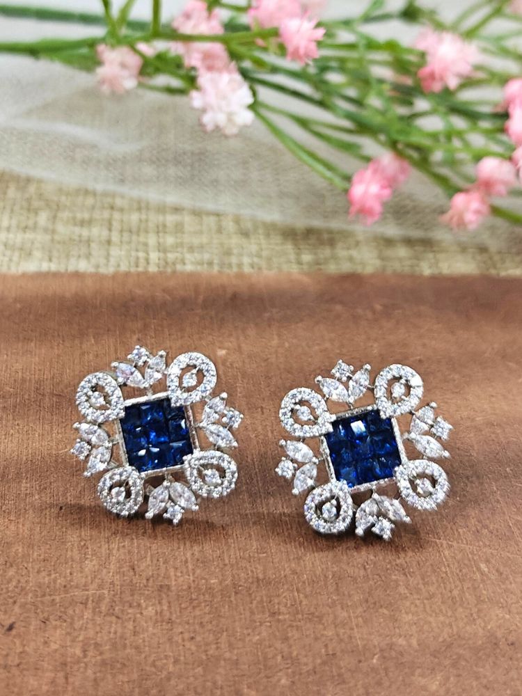 The Blue Zuri Earrings feature ornate navy blue square gemstones at the center, accented by intricate silver designs and sparkling American diamonds, displayed on a Black surface with White flowers in the background.
