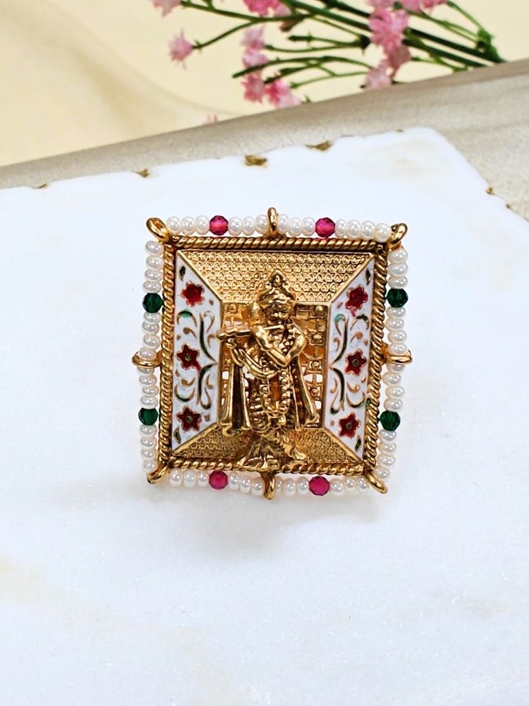 The Gopal Ring is a square, gold-toned adjustable ring featuring Krishna at the center, colorful enamel floral designs, pearl accents, and red-green bead details—an exquisite ethnic jewelry piece shown with pink flowers.