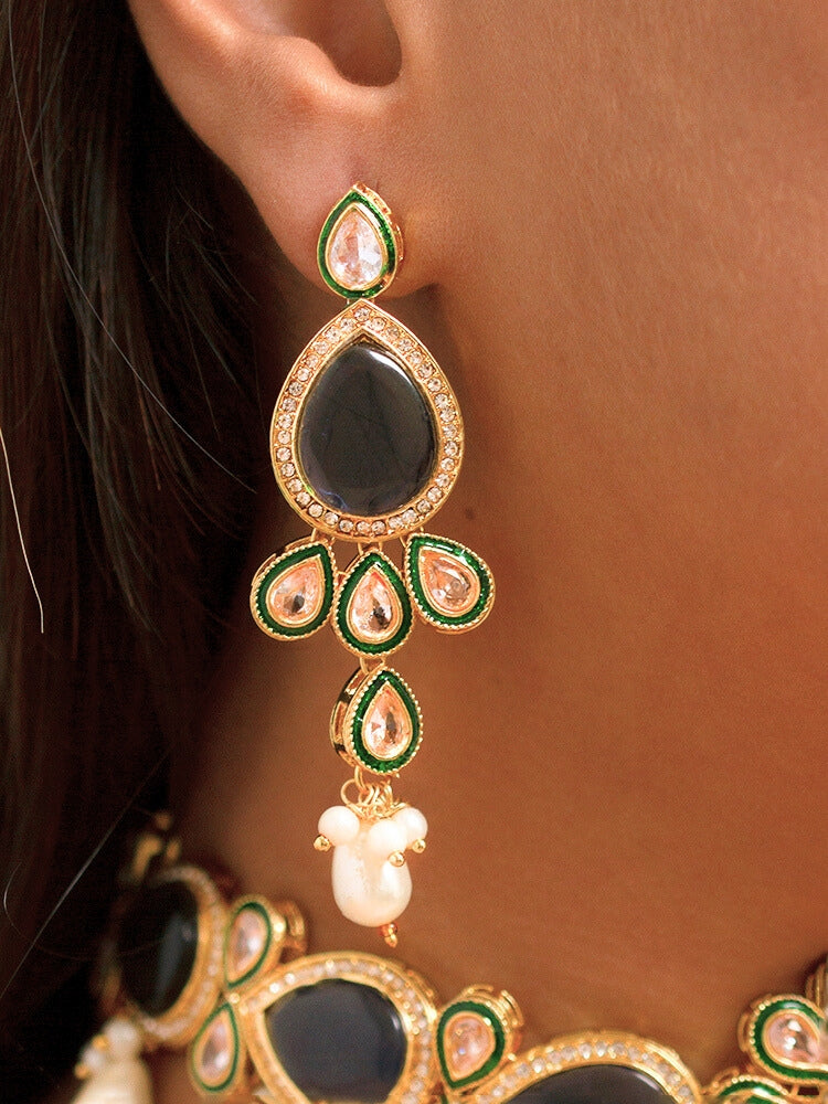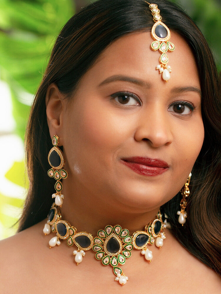 Elegant Aurora necklace set crafted with Navy Blue Monalisa stones, Kundan, and American diamonds. The captivating brilliance of Monalisa stones blends seamlessly with the traditional charm of Kundan, while American diamonds add a modern and sparkling touch. This sophisticated fusion makes the necklace set an ideal accessory for those who appreciate the perfect balance of timeless elegance and contemporary glamour. A standout choice for special occasions and celebrations.
