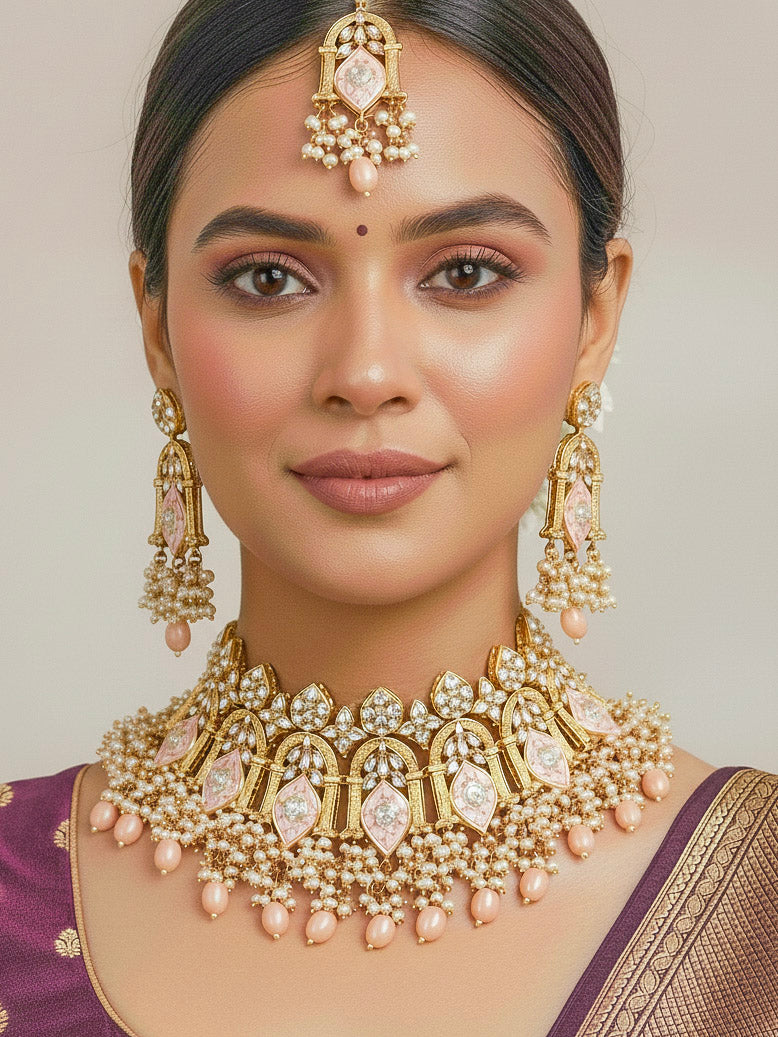 Indulge in regal allure with our Peach Heavy Kundan Meena Necklace Set, adorned with captivating tumble stones for a touch of sophistication. The deep peach hue, reminiscent of lush emerald gardens, beautifully harmonizes with the intricate Kundan and Meena work, creating a piece that resonates with opulence.