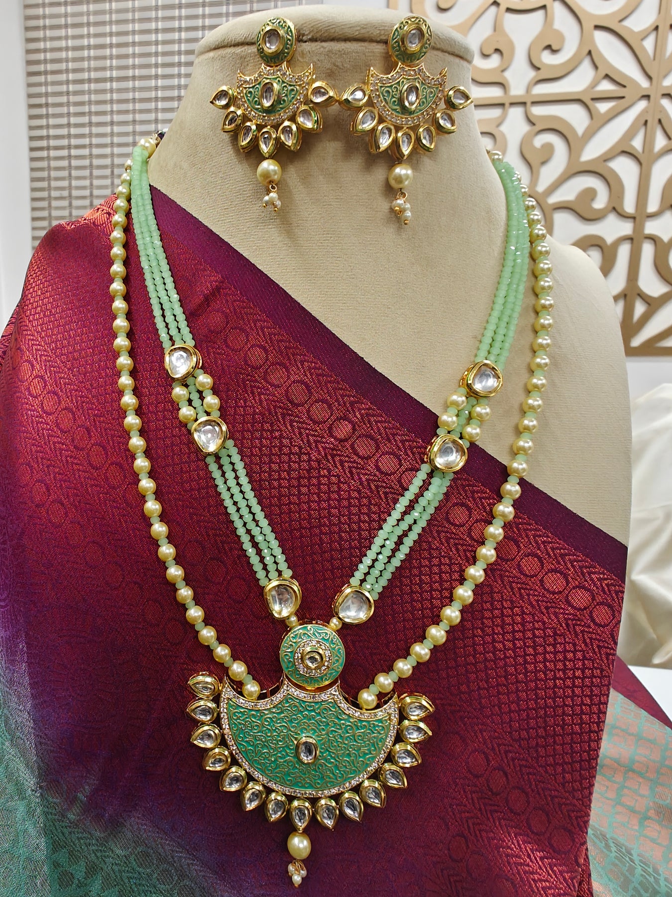 A mannequin in a in a deep red sari showcases the mint green Zareen Necklace Set, featuring gold and mint green tones with pearl accents, matching earrings, intricate designs, american diamonds, and elegant Kundan detailing.
