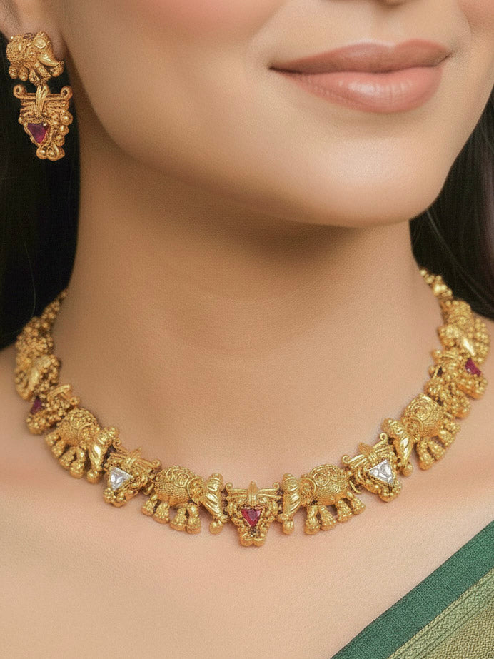 A woman smiles in a green and red saree, adorned with the Gajvani Red & White Necklace Set—gold necklace and earrings featuring intricate elephant designs with red & White colored stones. Great simple elegant temple jewelry necklace set for festive occasions