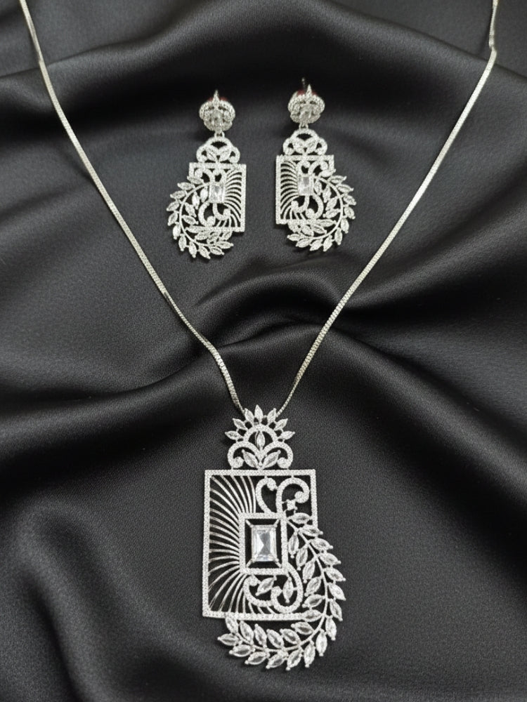 Introducing the Donna Pendant Set, a must-have for any fashion-forward woman. This set features a stunning silver pendant necklace and matching American diamond earrings, making it the ideal accessory for a girls day out or small functions. Elevate your style and effortlessly stand out with this beautiful pendant set.