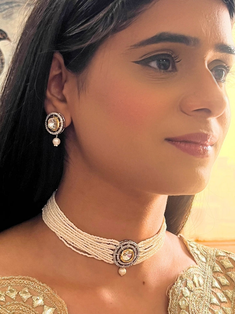 Peacoski's elegant Renu choker necklace set is a stunning fusion of classic and contemporary design. The focal point is a resplendent Kundan centerpiece, exuding traditional charm. Surrounding the Kundan are glistening American diamonds, adding a touch of modern glamour to the piece. The connecting mala is a strand of exquisite pearls, creating a timeless and sophisticated look. The combination of Kundan, American diamonds, and pearls results in a versatile and chic necklace set, ideal for both traditional and contemporary occasions, making a graceful statement wherever it is worn.