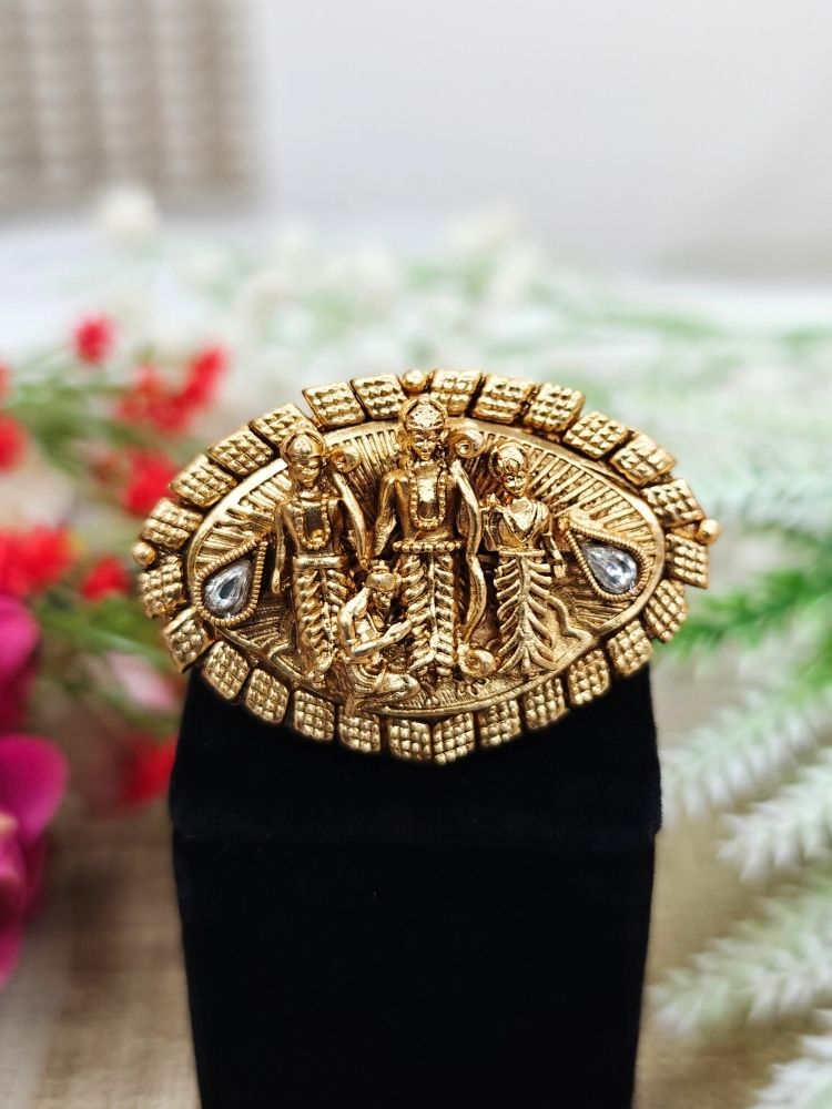 Experience divine blessings with the Ramratan Ring. This stunning gold temple ring featuring Ram, Laxman and Sita is perfect for poojas, temple visits, and religious ceremonies. Stay connected to the lord and add a touch of traditional elegance to your style.